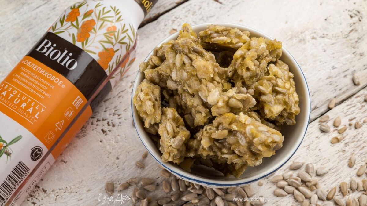 Когда сахар полностью растворится, а масса загустеет и потемнеет, снимите кастрюлю с огня. Добавьте в карамель очищенные семена подсолнечника. Тщательно перемешайте, чтобы карамель равномерно распределилась. - Шаг 4