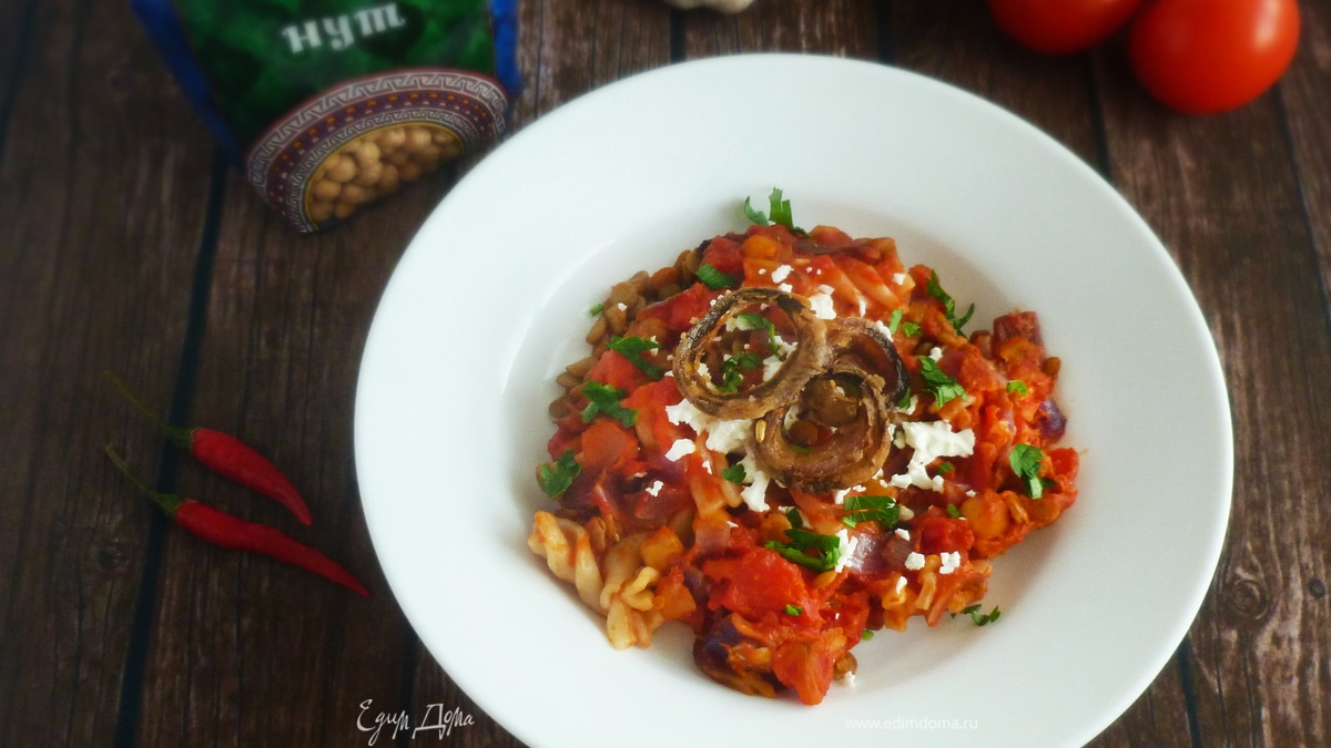 Разогреть духовку до 180°С. Соединить рис, макароны, чечевицу, томатный соус, треть феты, рубленую петрушку. Влить взбитые яйца и все перемешать. Выложить в большую форму и запекать 30 минут. - Шаг 8