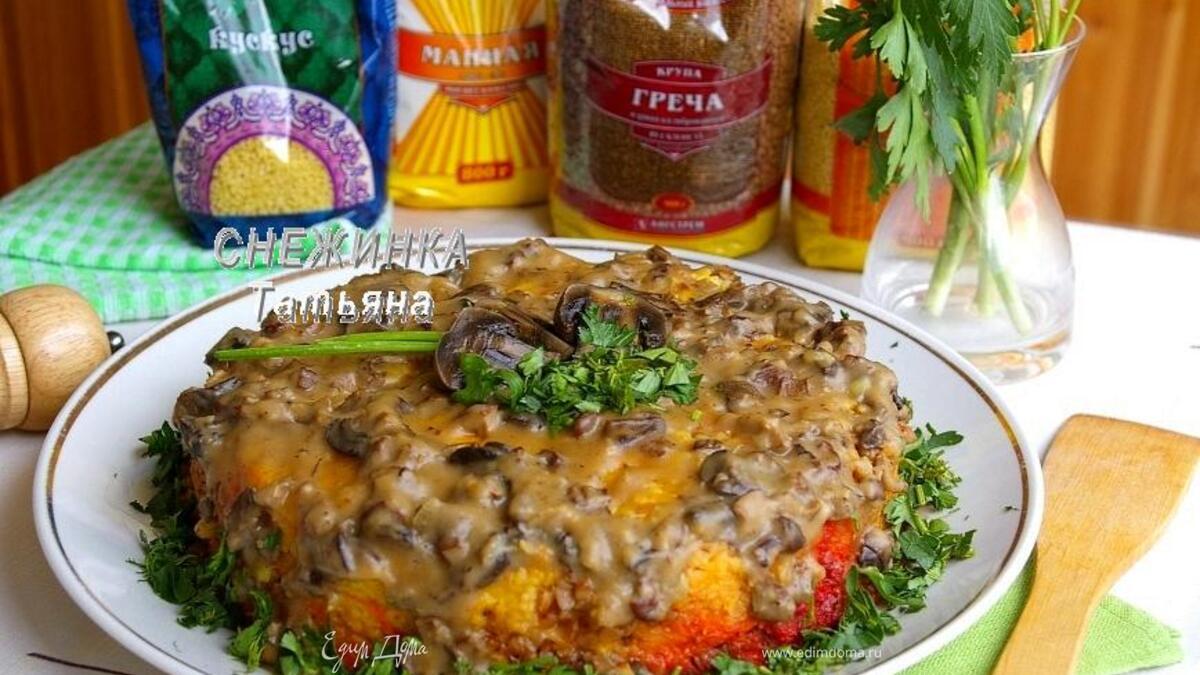 Из доступных продуктов — по-настоящему царское блюдо. Идея в том, что слой крупы чередуется со слоем овощей. Слои пропитываются друг другом, в результате пирог получается очень сочным и ароматным! Все ингредиенты очень полезны и питательны. Грибной соус создает завершающий аккорд. В пост можно приготовить такой слоеный пирог на праздничный стол, уверена, вы удивите близких или гостей. Да и не в пост, поверьте, вам будет очень вкусно!