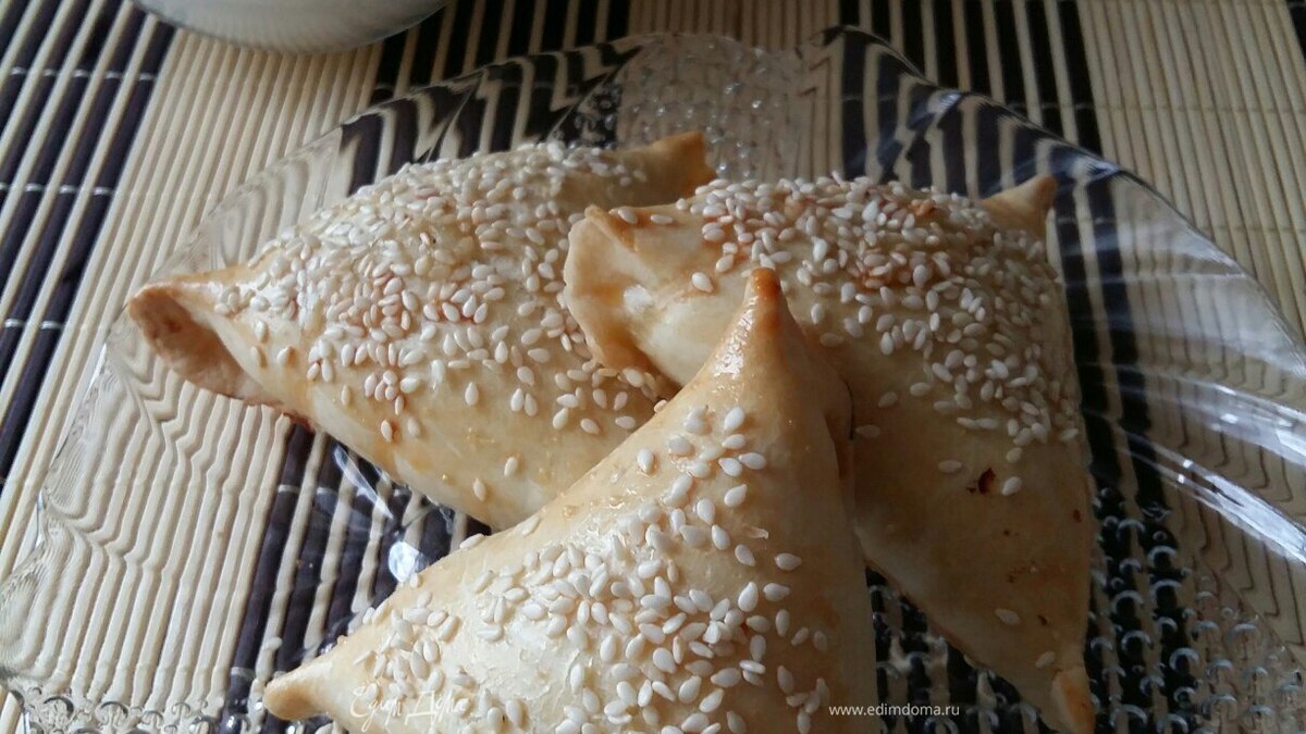 Готовые самбусики достаем из духовки, отделяем от пергамента, выкладываем на блюдо и наслаждаемся.