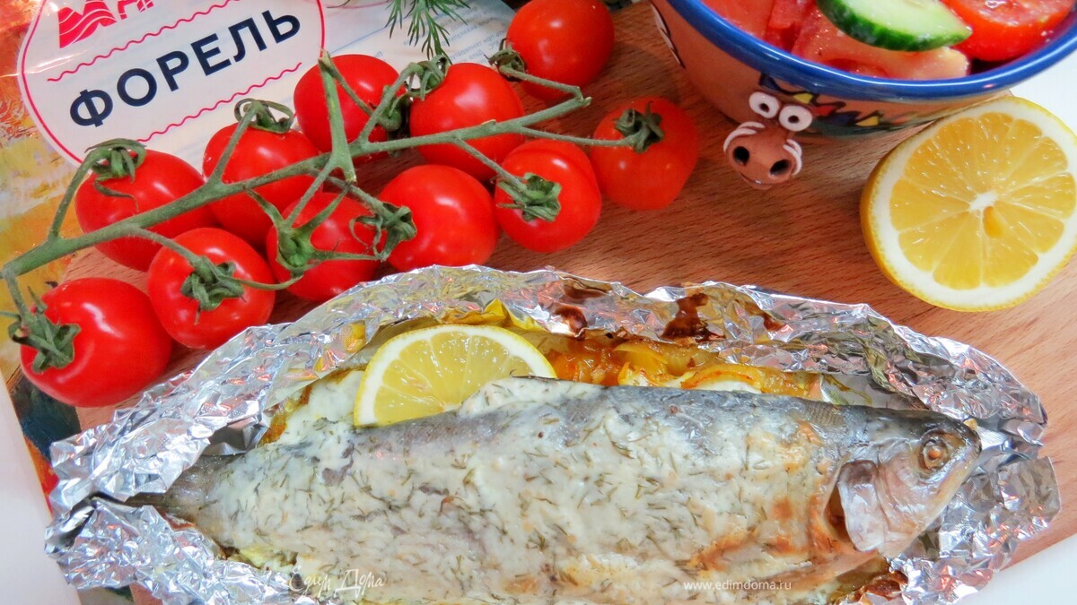 Противень застилаем пергаментом, а потом фольгой (для лучшей термоизоляции). Также из фольги делаем лодочки для каждой рыбки. В каждую лодочку выкладываем лук. Сверху — форель, распластав оную на животе. Закрываем лодочки, стараясь это сделать так, чтобы фольга не касалась шкурки рыбы. Отправляем в духовку при 180-200°C на 20–25 минут.