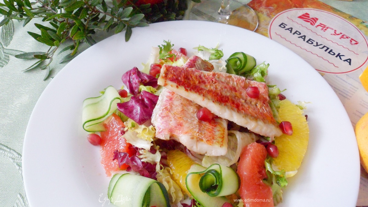 Этот салат с барабулькой хорош в любое время года. Цитрусовые принесут легкость и свежесть летом, зимой поднимут настроение своим ярким цветом. Рыба насытит организм необходимыми белками, микроэлементами и витаминами. Заправка для салата — смесь натурального гранатового соуса с оливковым маслом, придаст салату мягкую кислинку граната и несравненный аромат. За основу салата я взяла свою любимую сочную салатную смесь аликанте. Она состоит из салата радиччио насыщенно бордового цвета, хрустящего и сладковатого айсберга и сочных листьев фриссе. Салат очень прост в приготовлении. Сложность заключается только в обработке барабульки. Но результат того стоит. Салатный микс с барабулькой просто превосходен!