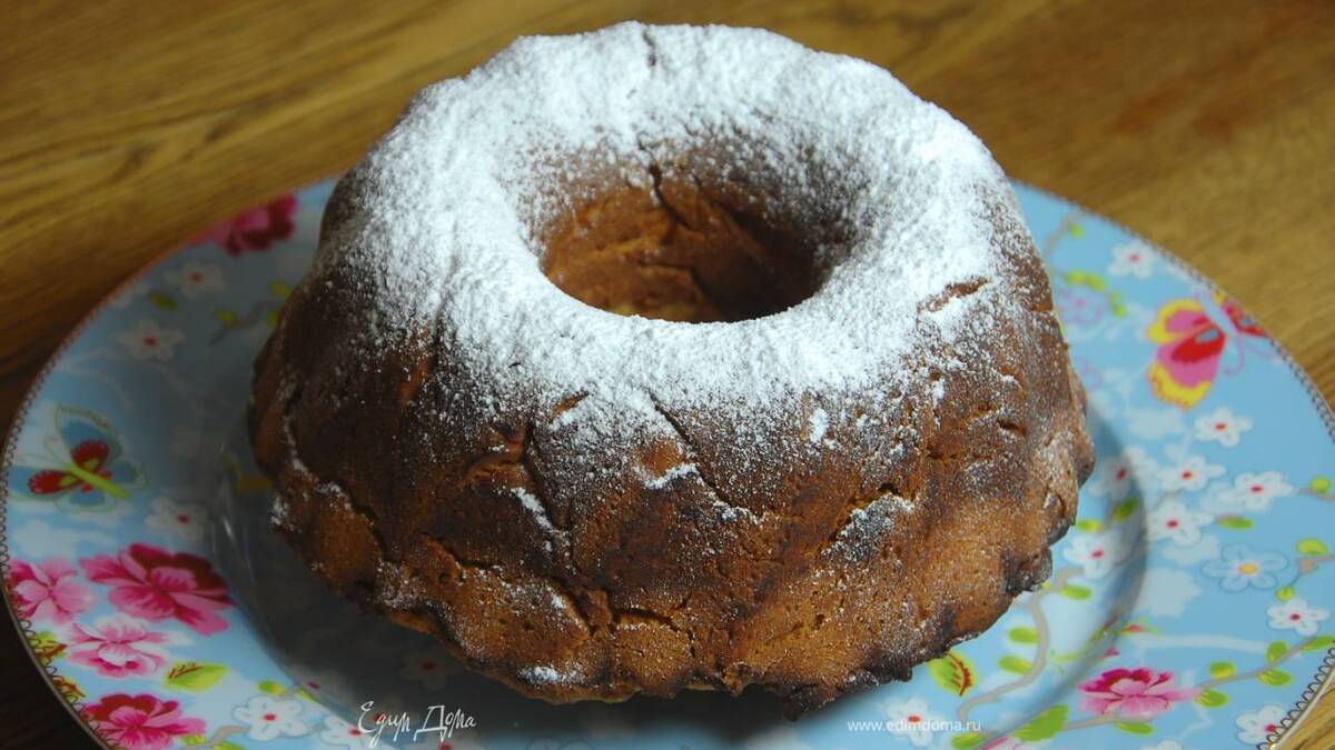 Готовую сдобу, перевернув форму, выложить на тарелку и посыпать сахарной пудрой.