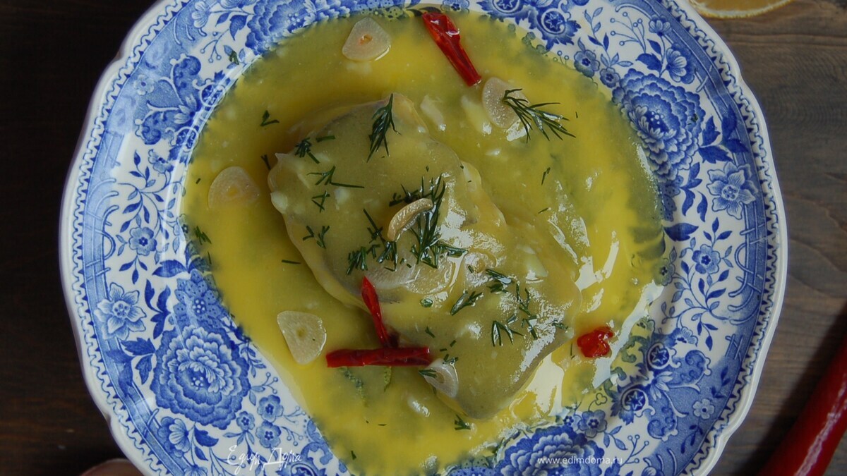 Аккуратно перекладываем кусочек рыбы в чистую миску. В отдельную чашку сливаем масло почти полностью. Остатки с белыми разводами (это и есть выступивший желатин) выливаем на рыбу. Слегка трясем миску. На глазах происходит образование эмульсии. Как только процесс пошел, перекладываем рыбу на сервировочную тарелку. В миску с соусом потихоньку вливаем перелитое оливковое масло, все время делая круговые движения миской. Добиваемся гладкой текстуры соуса. В конце можно перемешать соус ситечком до образования красивого однородного соуса. - Шаг 7