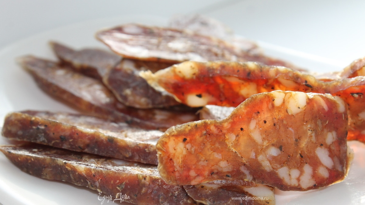 Поскольку колбаски были тонкими, они быстро потеряли влагу и практически готовы. Немного осталось подсохнуть в серединке и она станет равномерно плотная. И тем не менее уже можно нарезать и наслаждаться, получилось вкусно, ароматно и в меру остро.