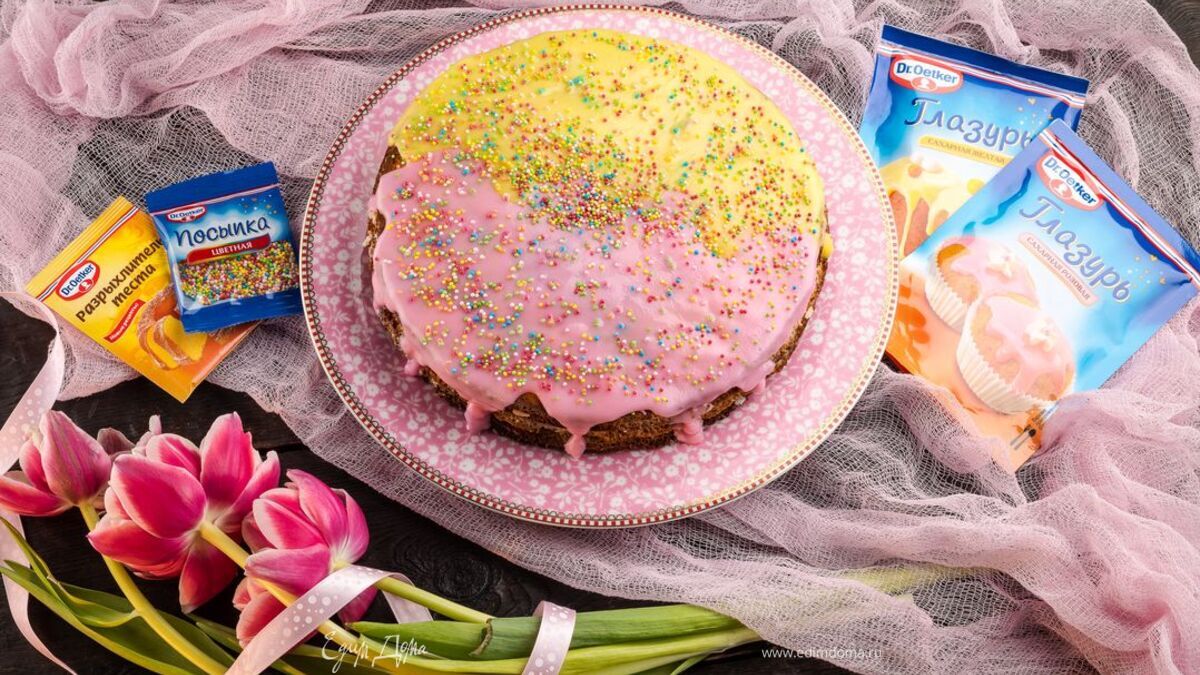 Приготовьте цветную глазурь Dr. Oetker по инструкции. Покройте глазурью верхний корж торта. - Шаг 7