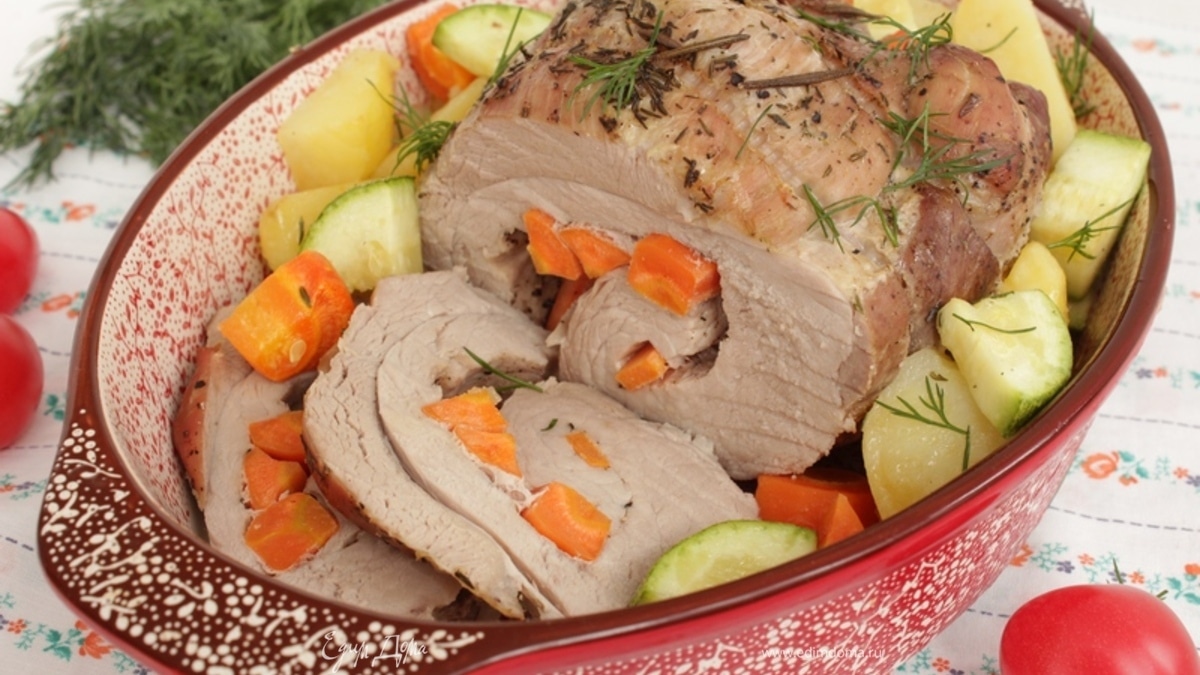 Затем мясо поставить в холодную духовку, выставить температуру 180-190°С и запекать около 1,5-2 часов. Подавать в горячем или холодном виде.