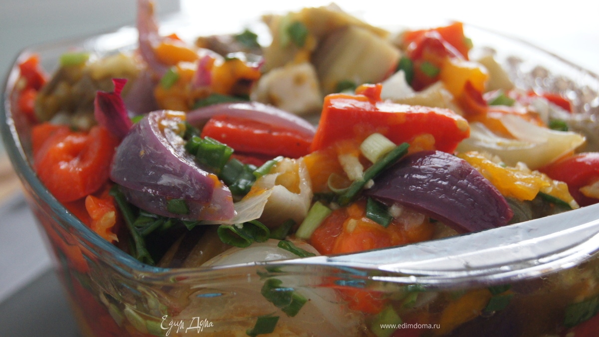 Выпекать в духовке 40 минут, пока овощи не станут мягкими.