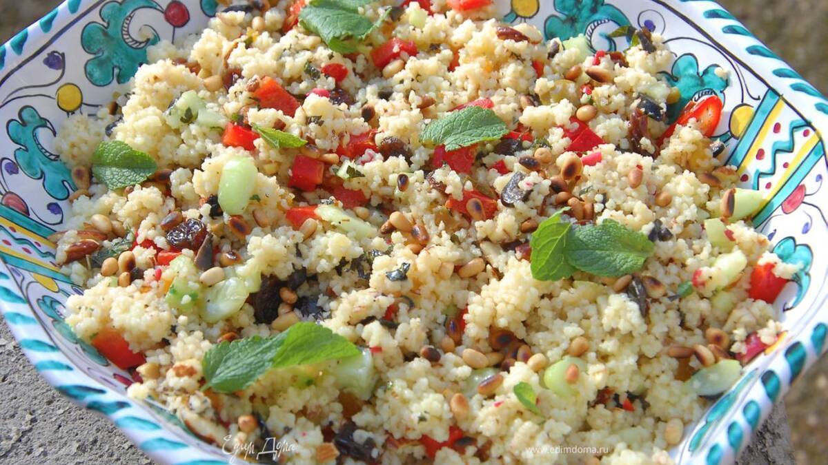 Готовый кускус размешать вилкой, добавить в кастрюлю оливки, курагу, изюм, огурец, сладкий и острый перец, мяту, измельченный миндаль и все перемешать. - Шаг 11