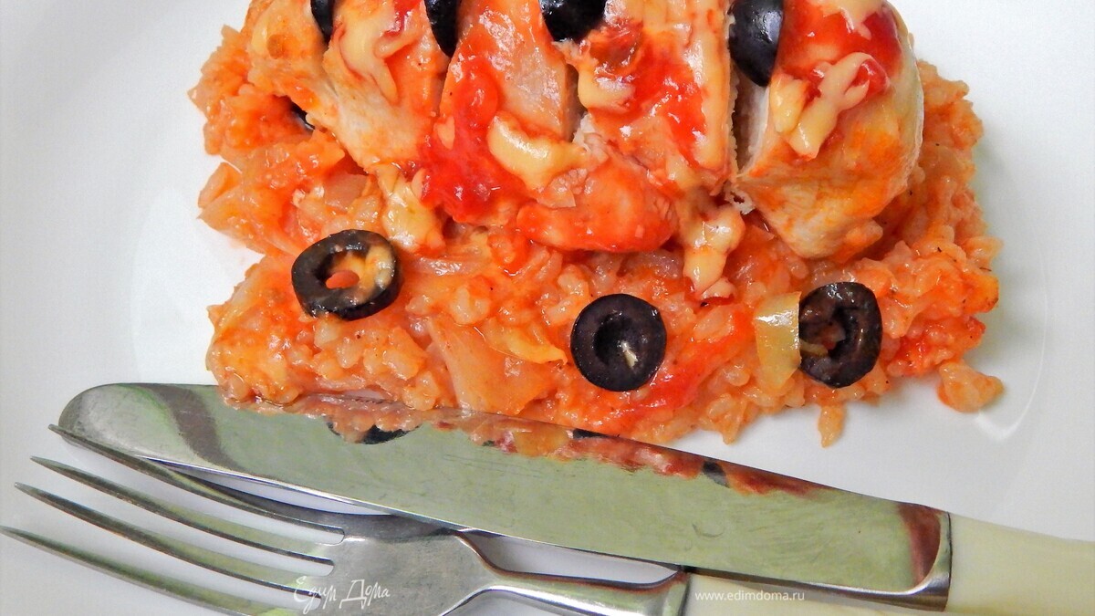 Переложить овощную массу в форму для запекания. Сверху выложить куриное филе. Накрыть форму крышкой и запекать в разогретой до 180°С духовке 35-40 минут, до готовности риса. - Шаг 10