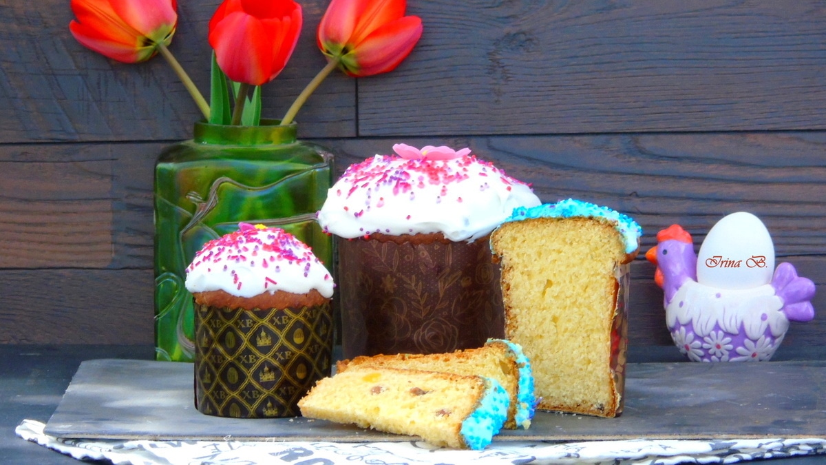 Даем остыть куличам и покрываем глазурью, для этого взбейте белок с 150 г сахарной пудры. Можете просто покрыть белой. - Шаг 13