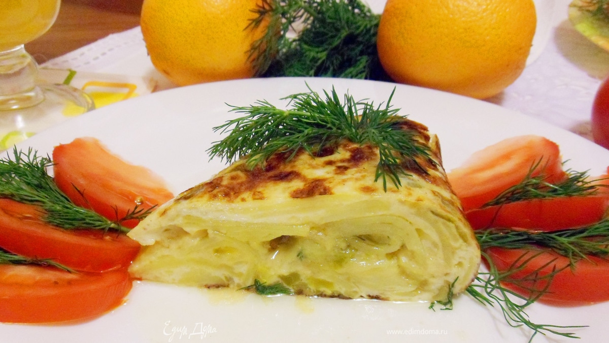 На огонь ставим сковороду с оливковым маслом. Когда сковорода хорошо нагреется, выливаем на нее картофельно-яичную смесь и ставим на средний огонь. Я сверху присыпала блюдо укропчиком (для красоты!). - Шаг 17