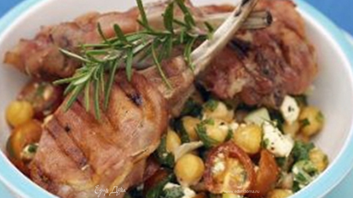 - Шаг 1Отбивные посолить-поперчить по вкусу, обернуть каждую полоской бекона и проткнуть деревянной палочкой. Каждый из 6 помидоров черри разрезать пополам. Мелко нарезать козий сыр и зеленый лук, добавить томаты, горох нут, петрушку, соус "Табаско", бальзамический уксус, растительное масло сахар и перемешать салат. Отбивные запекать в гриле по 5 минут с каждой стороны, а затем подать на стол вместе с салатом.