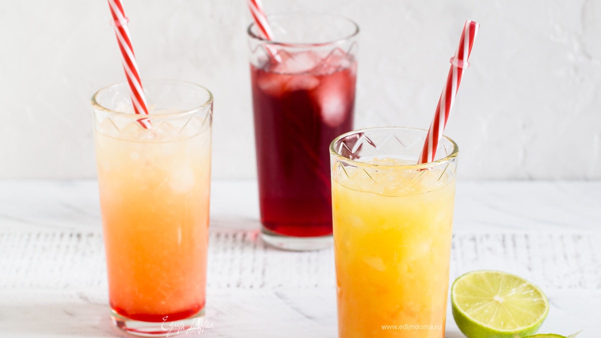 Сверху полейте клубничным сиропом, затем выложите слой льда. Влейте в каждый стакан по 50 мл Bacardi, апельсиновый сок, лед и немного сока лайма. - Шаг 5