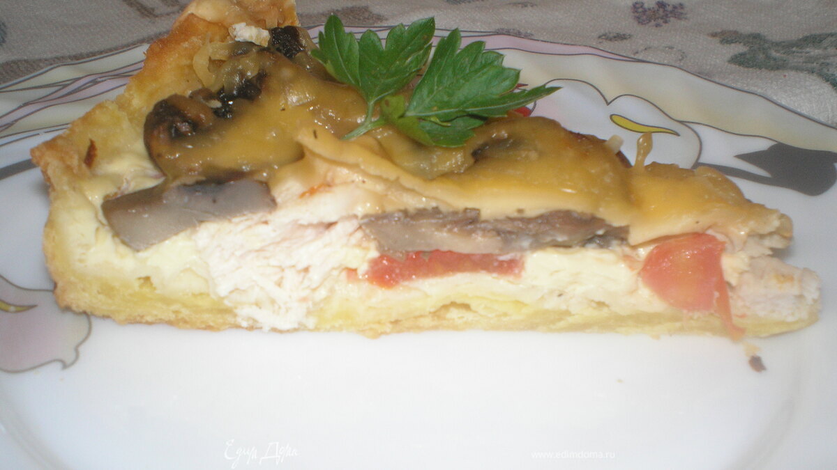 - Шаг 1Масло порубить ножом с мукой, замесить яйцом и ледяной водой.Желательно брать соленое масло, если нет, то просто в тесто положить соль по вкусу. Готовый шарик теста раскатать на противень диаметром 28 см. и положить в холодильник охлаждаться. Пока тесто охлаждается, натереть сыр, порезать заранее сваренную куриную грудку, помидоры и пожарить шампиньоны. Приготовить заливку, взбить яйца, добавить сметану и молоко, соль и перец по вкусу, можно также в заливку добавить мелко рубленый тимьян, но это тоже по вкусу. Когда тесто охладиться, сверху на тесто выстилаем бумагу для выпекания и высыпаем груз (либо специальные керамические шарики, либо сухую фасоль или горох)-это необходимо для того, чтобы тесто не поднялось, затем ставим в разогретую до 200 градусов духовку и выпекаем 15 минут, затем забираем груз и выпекаем еще 10 минут. После этого выкладываем в испеченный тарт кусочки куриного мяса, половину сыра, помидоры, жаренные грибы, оставшийся сыр и заливаем все это заливкой. Ставим опять в духовку и печем минут 25-30, пока не загустеет заливка. Вынимаем слегка остужаем и с удовольствием употребляем.