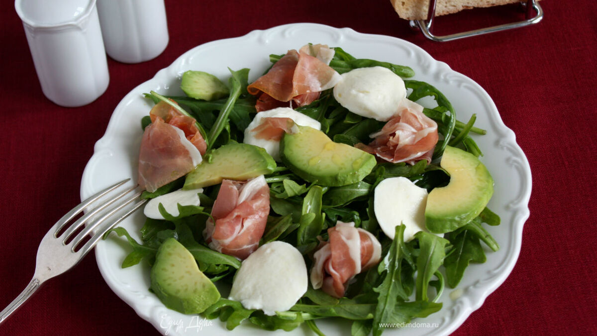 Сверху на руколу поместить моцареллу, ветчину, ломтики авокадо. Полить оливковым маслом, приправить солью и перцем .