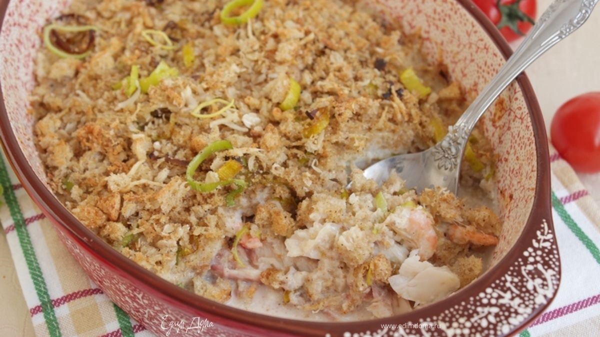 Рыбный крамбль позволит вам накрыть вкусный и оригинальный ужин для всей семьи. Масло виноградное Biolio подчеркнет аромат этого блюда.