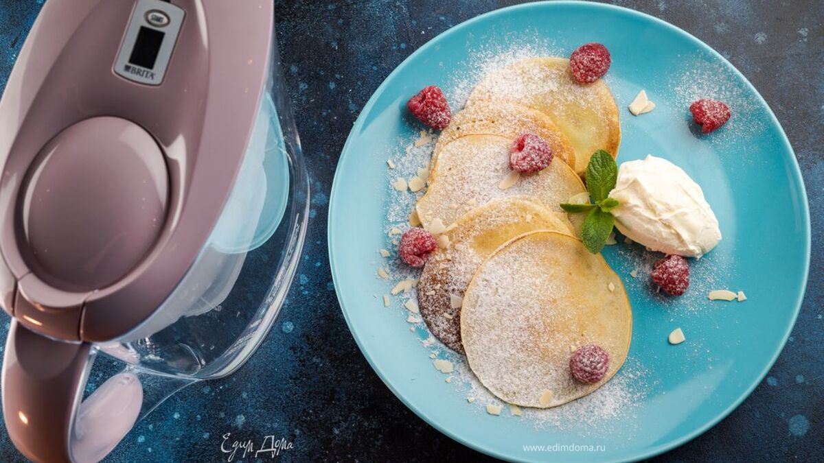 Выложите блинчики на плоскую тарелку, смажьте сливочным маслом и добавьте в середину несколько ягод малины. Подавайте со сметаной. Для приготовления этого вкусного завтрака мы использовали воду из фильтра-кувшина BRITA Marella Pastel.