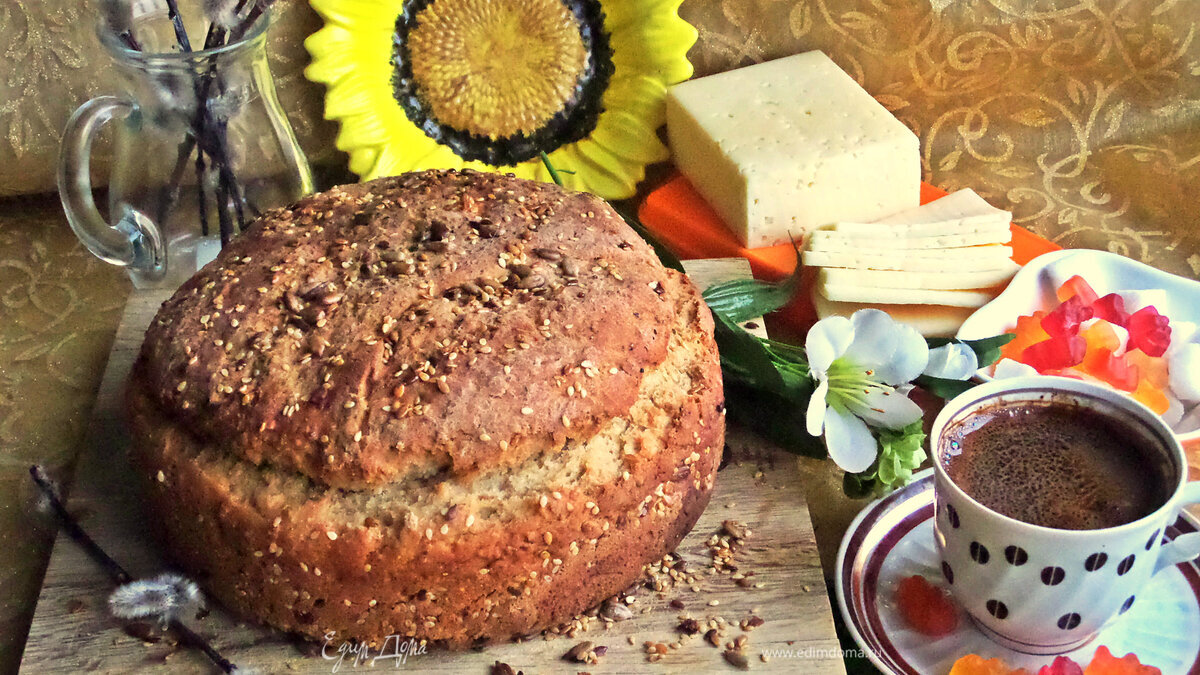 Вот такой хлебушек я испекла в керамической кастрюле, которую получила в подарок от Ю. Высоцкой! Получился очень удачный, и такое душевное название «каравай» особенно подходит. Идеально для бутербродов при чаепитии или перекусах. За основу взяла рецепт у Ленушки87, но вместо льняного семени взяла кунжут для аромата, тем более жареный, и овсяные хлопья заменила отрубями. Хлеб имеет приятный ореховый аромат.