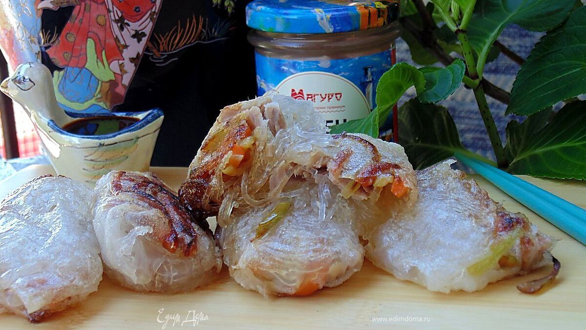 Листы рисовой бумаги смачивать в глубокой тарелке с водой. На лист выложить немного овощной начинки, горсть рисовой лапши и немного тунца. - Шаг 6