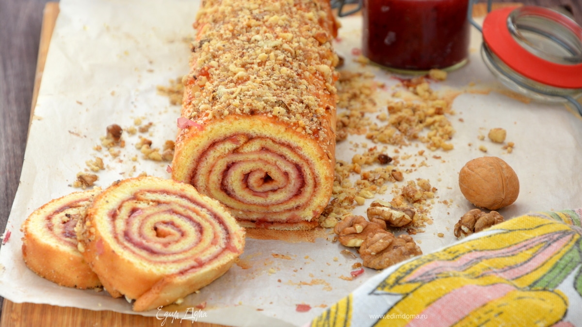 Срезать края. Смазать рулет абрикосовым или любым другим джемом и сверху посыпать орешками. Приятного и уютного чаепития!