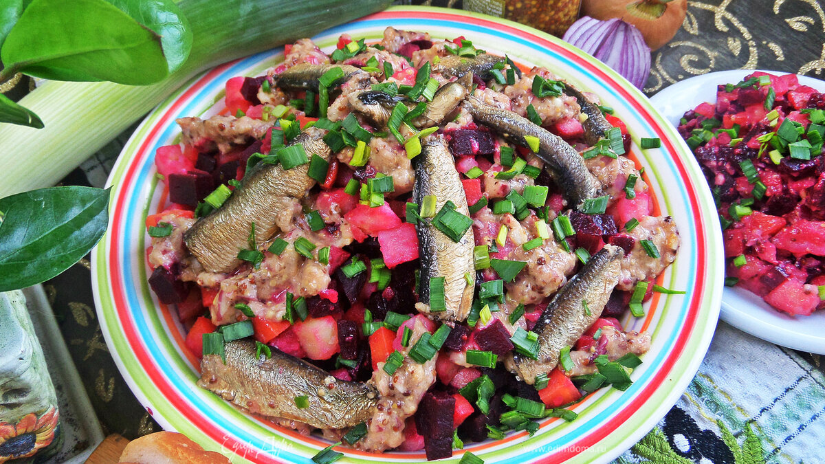 Я выставляла винегреты не раз, так как люблю их! Сегодня покажу с двумя видами лука, а подать можно вот так — с любимыми рижскими шпротами (можно заменить скумбрией или сардинами).