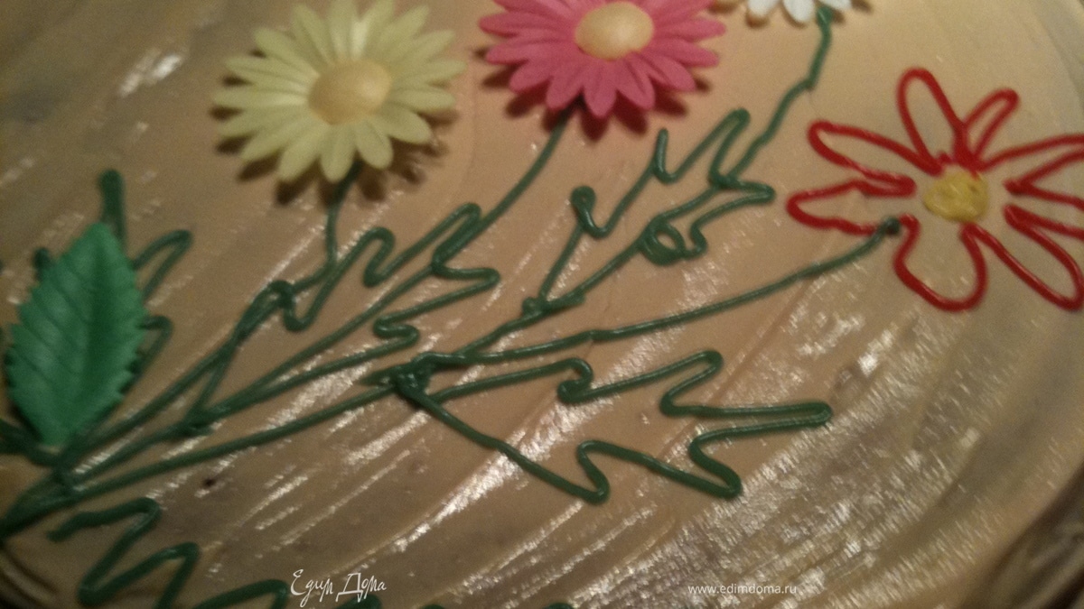 - Шаг 1Для теста взбить яйца с сахаром добела, добавить сметану и какао, перемешать, всыпать муку и соду гашеную - вымешать тесто. Разделить на 2 части, выпекать при 170-180, 15 минут. Остудить, разрезать каждую часть на 2 части ( итого 4 коржа). крем: взбить ингредиенты и смазать коржи. Украсить по усмотрению.