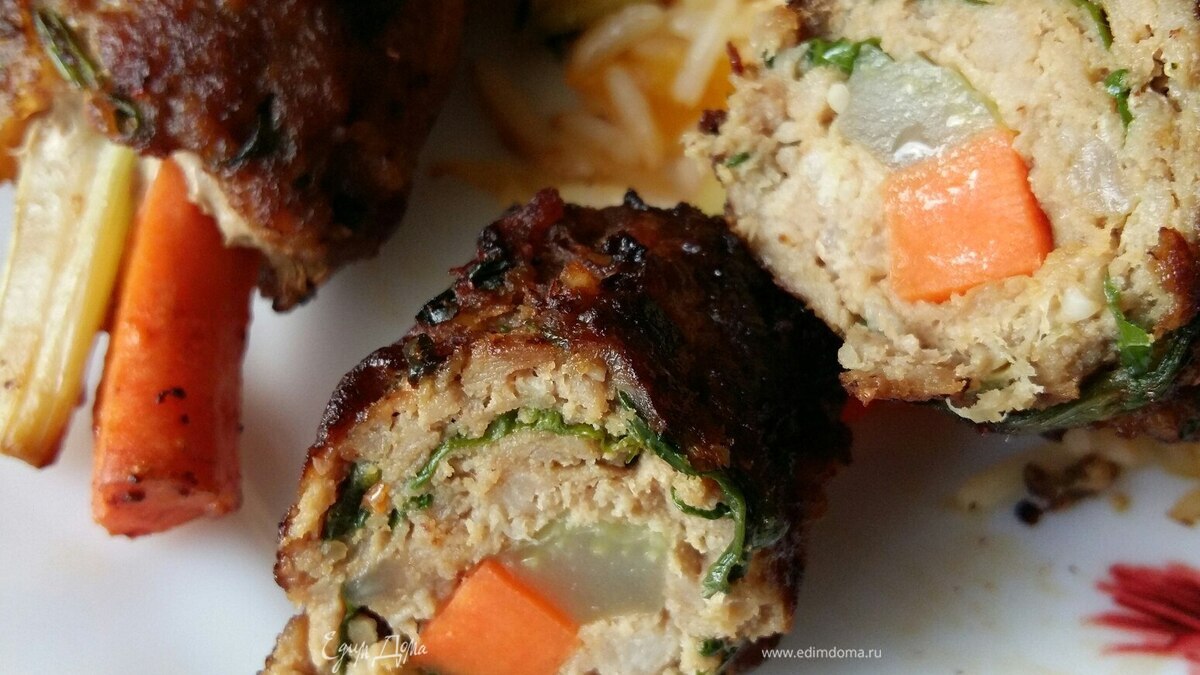 Выкладываем горкой на блюдо рис с овощами, сверху укладываем наши котлетки.
