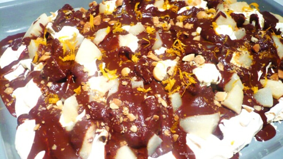 - Шаг 8«Собирать» торт нужно непосредственно перед подачей, поэтому, как вариант, все составляющие можно приготовить заранее и собрать только перед подачей-это займет 1 минуту. Безе обсыпать половиной орешков. Выложить ложкой здесь и там половину сливок. Залить половиной шоколадного соуса и выложить большую часть груш. Далее выложить остатки сливок, орехов, груш и полить оставшимся шоколадным соусом. Посыпать цедрой апельсина. Я думаю, можно модифицировать этот десерт и подавать его порционно, в формах. Так или иначе, поливать шоколадом нужно в последний момент, чтоб красиво смотрелось.