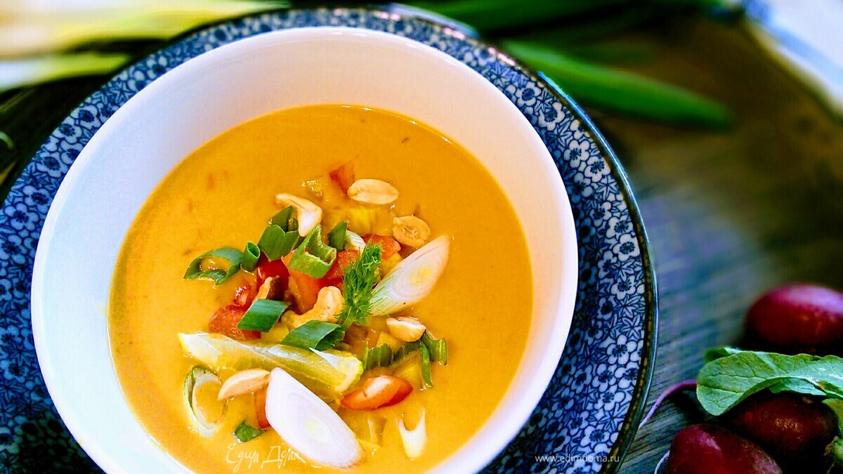 Батат чем-то напоминает тыкву. Это сладкий картофель, который необычайно хорошо ведет себя в крем-супах, придавая им шелковистую консистенцию и приятный радостный оранжевый цвет. По своим питательным характеристикам намного полезнее и усвояемее обычного картофеля. Батат превосходит картофель по содержанию клетчатки, железа и кальция. Если вы никогда не пробовали сладкий картофель, начать знакомство с ним лучше всего с нежного супа-пюре. Вкус супа сбалансирован. Ни один из ингредиентов «не тянет одеяло на себя», а выгодно сочетается в букете ароматов и вкусов. Попробуйте!