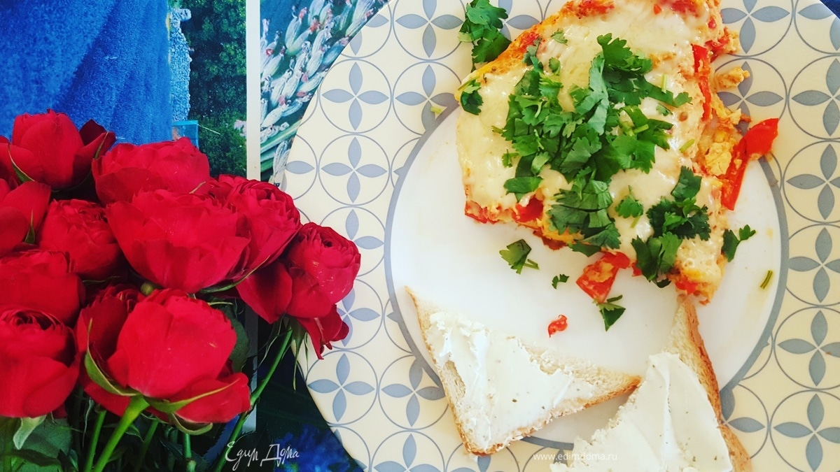 - Шаг 5После того, как наш сыр расплавится, раскладываем порционно по тарелочкам, посыпаем зеленью и угощаем своих близких) К этому чудесному омлету рекомендую подавать обжаренный с небольшим количеством оливкового масла тостовый хлеб (желательно на сковороде для гриля) намазываем любимый сливочный сыр и вуаля — полезный и вкусный завтрак готов!