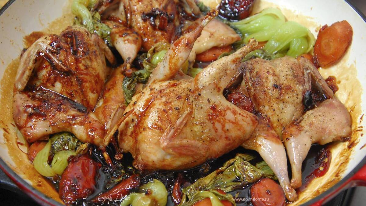 Готовых запеченных перепелок выложить в сотейник с овощами, все перемешать и выключить огонь.