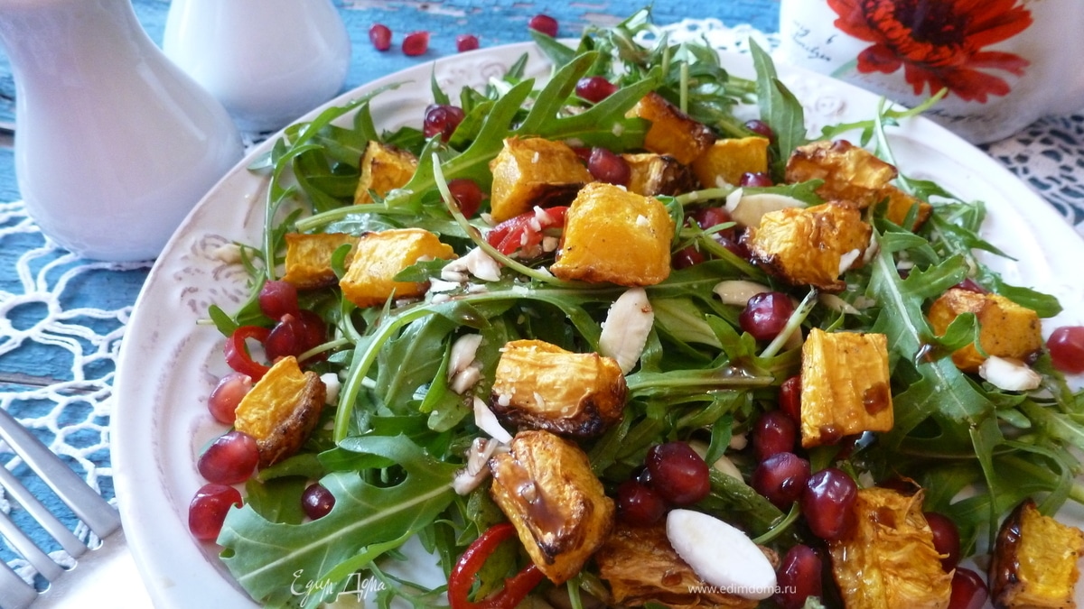 Зеленый салат с запеченной тыквой, гранатом и миндалем