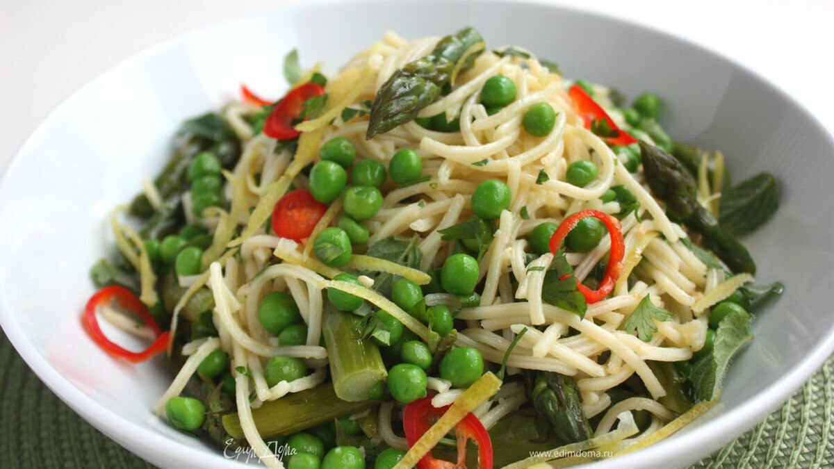 У меня опять паста, но совсем зеленая. Я собрала к ней вкусные садовые ингредиенты: спаржу, сладкий горошек, петрушку, мяту. Получился этакий маленький весенний праздник в отдельно взятой тарелке.)) Даже сыр и тот с зеленью (в ингредиентах не удалось такой указать, поэтому пишу здесь: сыр сливочный с зеленью). Я предпочитаю обжаривать спаржу, а не варить, т.к. покупаю очень нежные побеги. Пасту, конечно, можно взять любую.