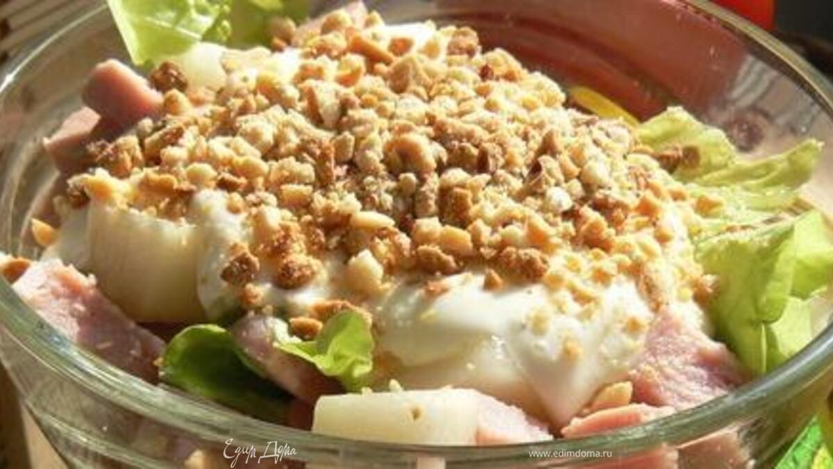 - Шаг 11. Нарежьте ветчину небольшими кубиками. Груши помойте и нарежьте тонкими ломтиками. Грецкие орехи нарубите. 2. Чеснок мелко порубите. Листья салата порвите на небольшие кусочки. Майонез смешайте с лимонным соком. 3. Перемешайте ветчину, чеснок, груши, листья салата. Посолите и поперчите. Полейте салат майонезно-лимонным соусом и посыпьте грецкими орехами.