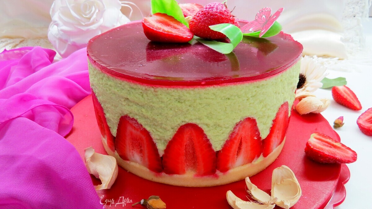 Тортик получается очень вкусным: бисквит женуаз, клубничный мармелад с кусочками свежей клубники, нежный фисташковый мусс и красочный внешний вид —